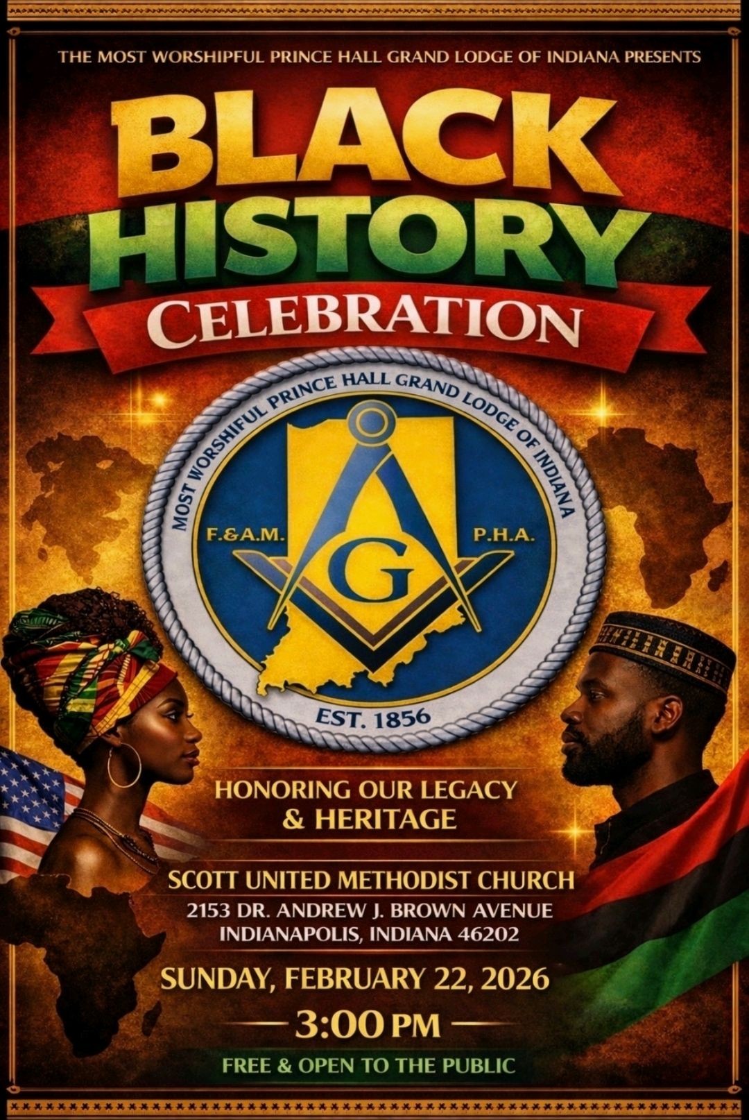 Prince Hall Grand Lodge of Indiana Black History Program Feb 22 Prince Hall Grand Lodge of Indiana Black History Program 3:00 pm - 6:00 pm
